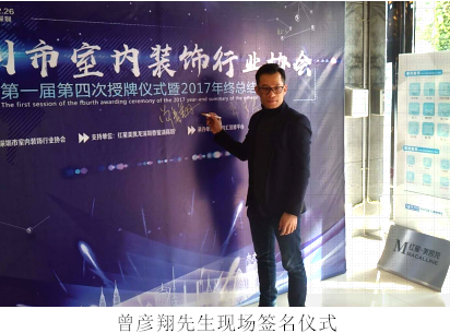 當前位置:首頁 > 新聞中心 > 企業(yè)動態(tài) 2017年12月26日,深圳市室內裝飾行業(yè)協(xié)會第四次授牌儀式暨2017年終總結大會于深圳紅星美凱龍香蜜湖商場隆重舉辦。此次授牌儀式有來自優(yōu)秀企事業(yè)單位及設計師人才400多位精英共同見證這個激動人心的時刻。深圳市彥翔設計顧問有限公司執(zhí)行總監(jiān)曾彥翔先生受邀本次授牌儀式活動,同時當選深圳市室內裝飾行業(yè)協(xié)會第一屆理事一職。