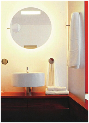 圓形的鏡子與洗手盆使整個空間顯得更加活潑