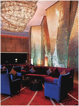 設(shè)計(jì)師用大自然中抽取各種自然元素,山、水、云、星混為一體,黃色、綠色、白色等營(yíng)造出一種豐收、喜悅以及祥和的氛圍,有一種城市中的森林之感。大堂的裝飾非凡,包括一面黃金雕塑墻面和LED燈墻面,為酒店奠定了清新現(xiàn)代的風(fēng)格。在設(shè)計(jì)上墻為山、地為水、燈為云。以山為形的黃金墻仿佛太陽(yáng)之光灑遍山間,閃耀金輝,天花吊頂是伴于山間的團(tuán)團(tuán)白云,仿佛流水般緩緩傾泄的花崗石紋地面與點(diǎn)點(diǎn)綠色相呼應(yīng)。