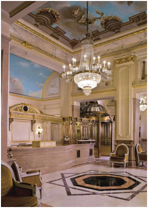 總服務(wù)臺(tái)頂面的壁畫具有典型的裝飾作用,搭配金色的線腳和水晶吊燈顯得輝煌大氣