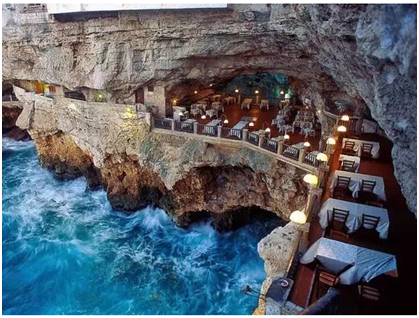 在意大利南部的波利尼亞諾海濱(Polignano a mare)小鎮(zhèn),有一個非常獨特的洞穴餐廳叫Grotta Palazzese(Grotta在意大利語中的意思就是“溶洞”),只在夏季(每年5月-10月)開放,餐廳建在一個拱形的石灰?guī)r溶洞內(nèi)。所以以石頭為墻壁,向外伸向大海就是這家餐廳的最大特色啦!其實這個餐廳是Grotta Palazzese酒店的一部分。