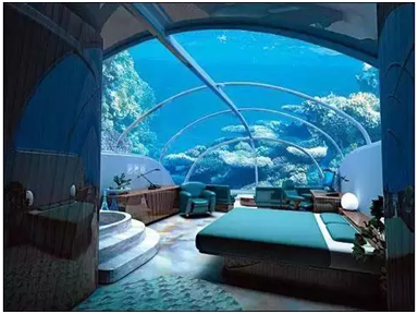 由一位美國富翁投資建造的世界第一家海底五星級酒店“海神酒店”位于巴哈馬德伊柳塞拉島。酒店共耗資4000萬美金建成,投資者布魯斯瓊斯認為,觀看奇特的海底世界是每個人的夢想。設計的靈感來源于海洋生物學家雅克·庫斯托,而設計的初衷,是為了給房客們展現(xiàn)出海底的原貌。酒店建于德伊柳塞拉島水底18米以下的地方,四周圍有珊瑚群圍繞,客人們可以通過潛水艇或者與海灘休息廳相連通的隧道進入酒店,客人們無需穿著潛水服就可以來到這個海底酒店。據(jù)悉,酒店內(nèi)擁有22個單間和2個豪華套間,如此高科技的酒店設備,入住一晚的價格為3500英鎊。